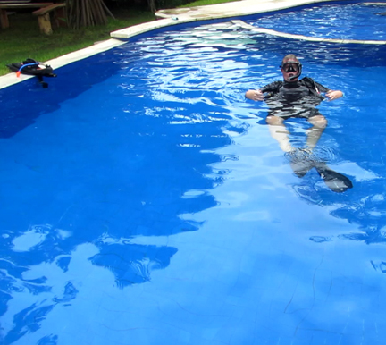 Notre piscine se trouve derrière le centre et peut accomoder jusqu'a 4 élèves et 1 instructeur. Une partie peu profonde pour se mettre a l'aise et une partie profonde pour simuler la mer.
